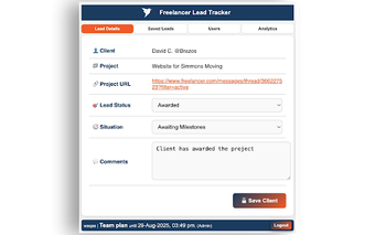 Freelancer Lead Tracker adalah ekstensi Chrome yang dirancang untuk mempermudah manajemen klien dan lead di platform Freelancer.com. Dengan fitur penyimpanan klien satu klik, pengguna dapat dengan cepat menangkap detail klien dan proyek dari pesan. Selain itu, ekstensi ini memungkinkan pengguna untuk melacak obrolan dan mengorganisir lead berdasarkan status dan situasi, seperti 'Urgent' atau 'In Negotiation'. Fitur ini sangat membantu freelancer dalam mengelola proyek dan klien secara efektif.
